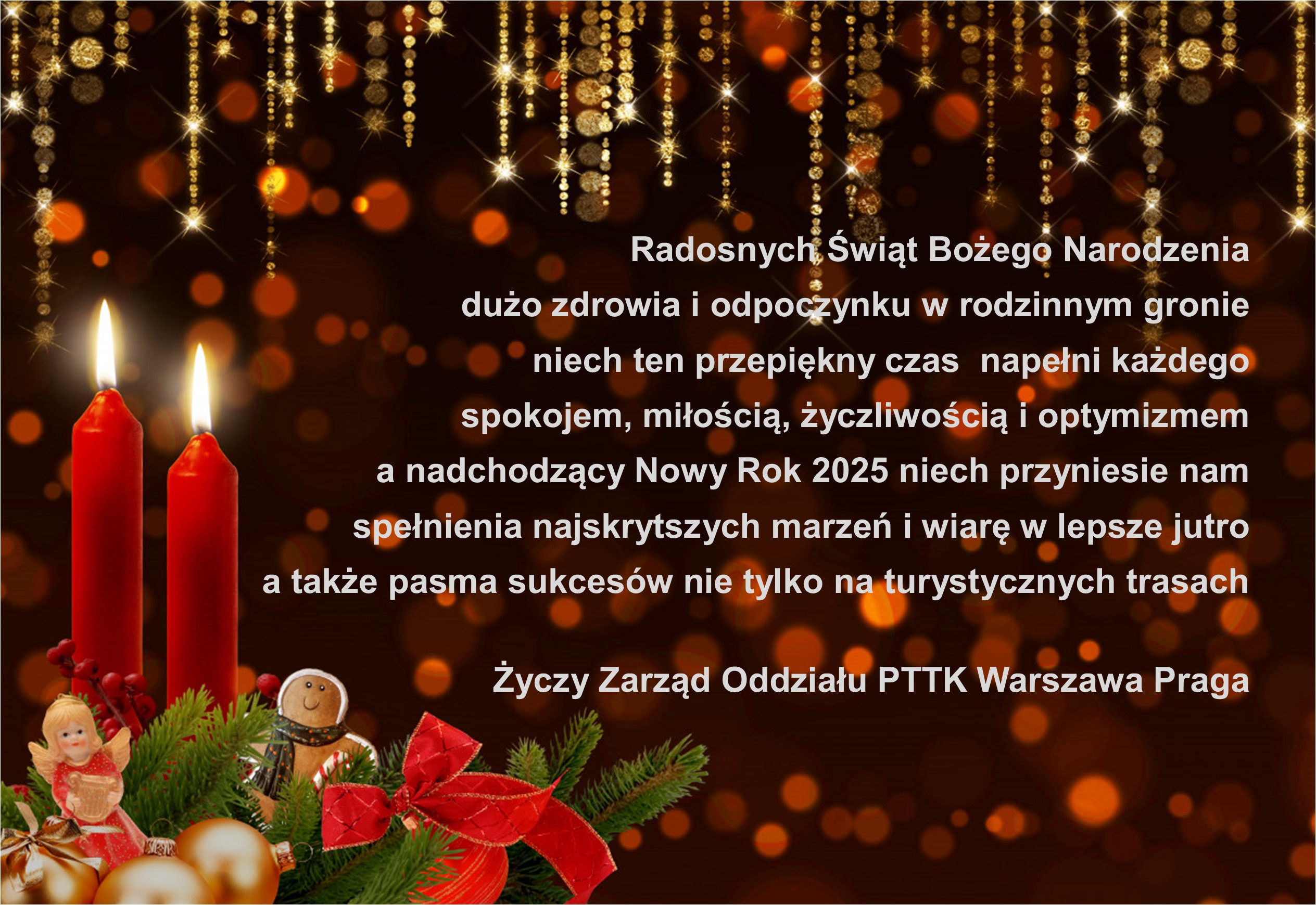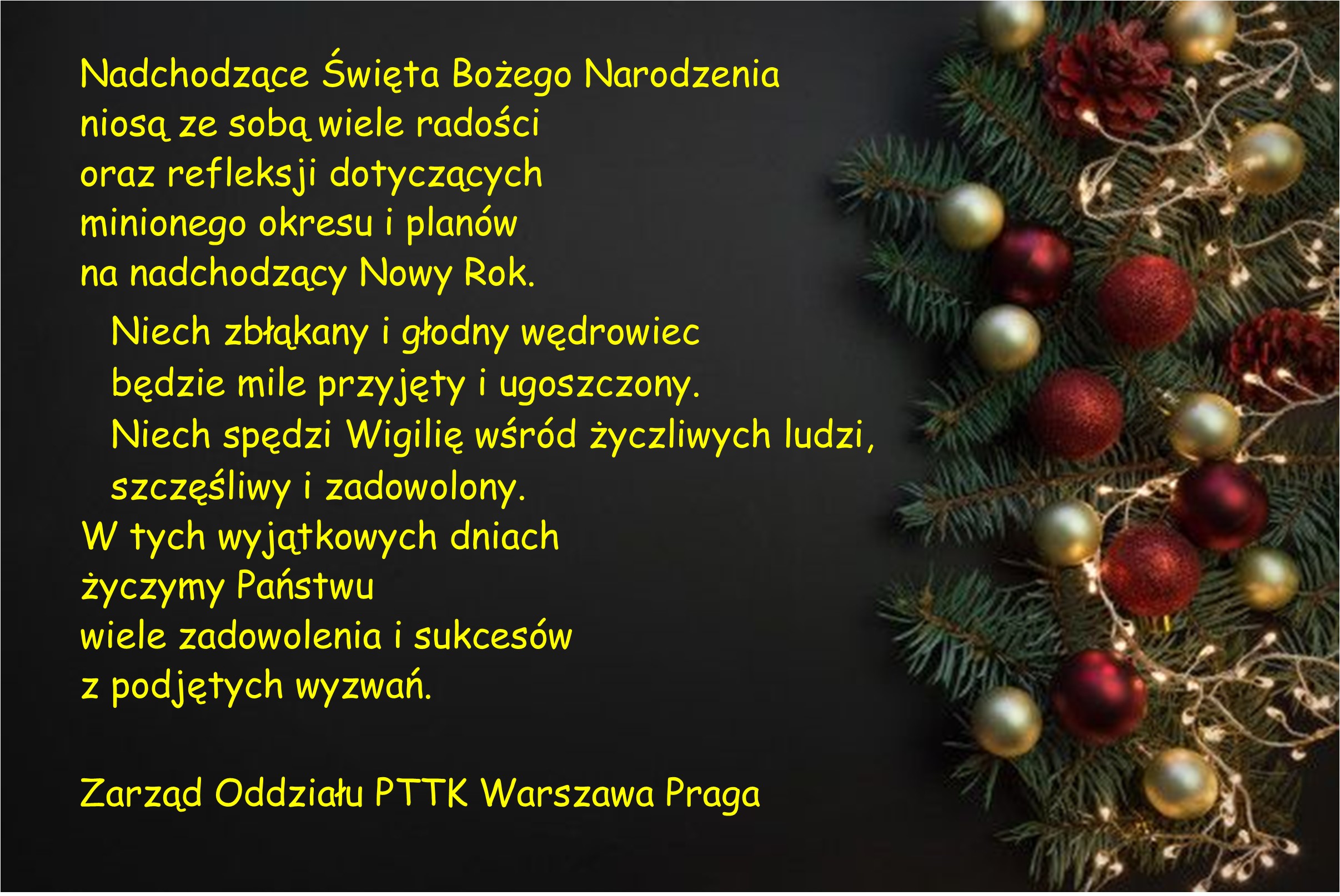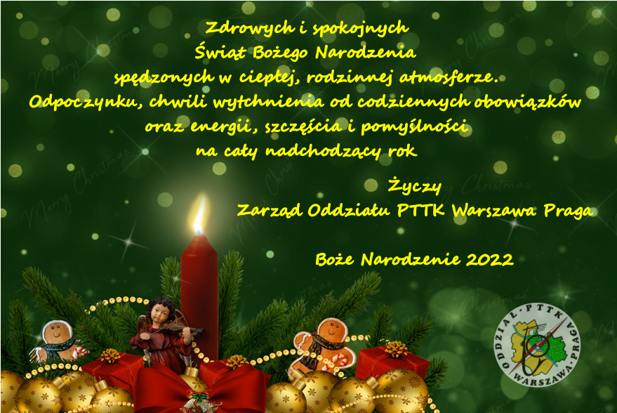 W imieniu Zarządu Oddziału PTTK Warszawa Praga zapraszam na spotkanie wigilijne, które odbędzie się w dniu 18 grudnia 2019 r.(środa) od godz. 17.00 w siedzibie oddziału przy al. Stanów Zjednoczonych 24 w kawiarence (na wprost wejścia). Miło będzie nam Was gościć.