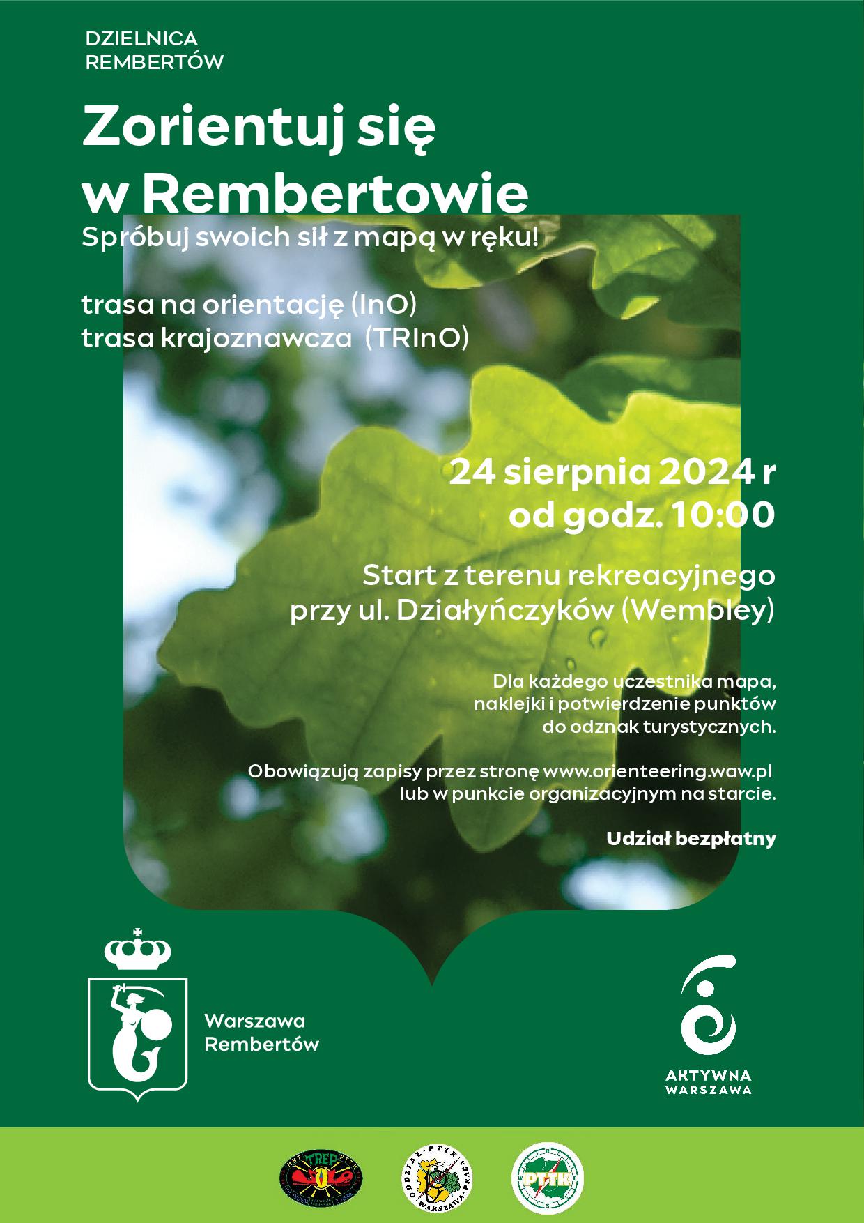 Zapraszamy na imprezę "Zorientuj się w Rembertowie" organizowaną przez Urząd Dzielnicy Warszawa Rembertów M. St. Warszawy przy współpracy Aktywnej Warszawy i Oddziału PTTK Warszawa Praga. Na imprezie oprócz trasy InO odbędzie się inaugurację trasy TRInO. Spotykamy się w sobotę, 24 sierpnie 2024 r. na terenie rekreacyjnym przy ul. Działyńczyków. Start od godz. 10:00. Zapisy na stronie orienteering.waw.pl.